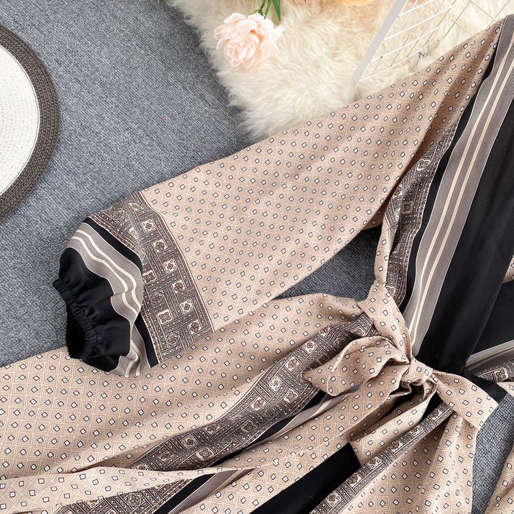 Robe vintage marron à col en V et manches longues bouffantes imprimées à la taille AR1003