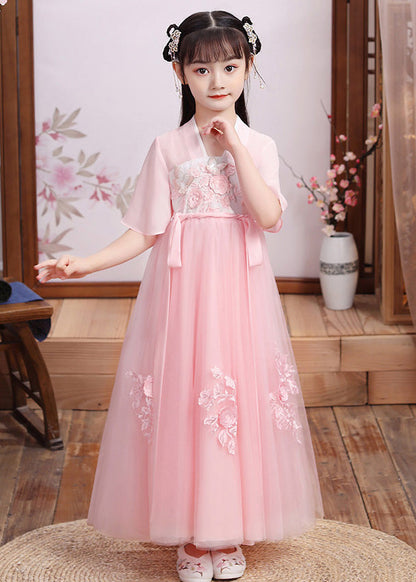 Boutique Pink V Neck Layered Patchwork Tulle Girls Maxi Dress Short Sleeve