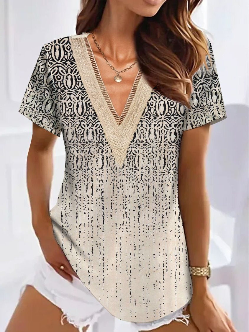 V Neck Split Joint Lace Ethnic Printed Casual Blouses QAF35