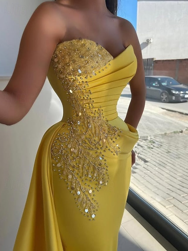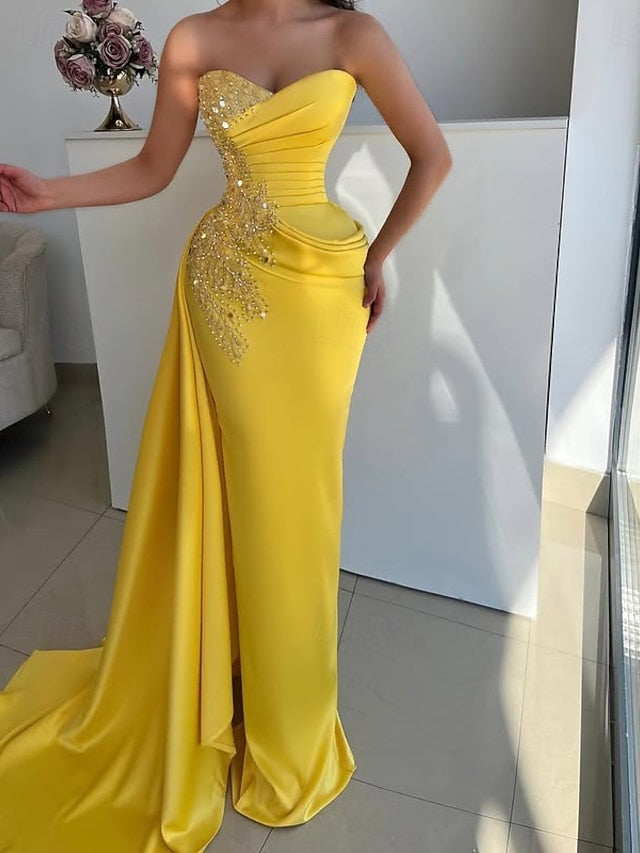 Occasion: Graduation, Formal, Wedding, Style: Elegant, Silky, Silhouette: Mermaid / Trumpet, Hemline / Train: Floor Length, Neckline: Strapless, Fabric: Satin, Closure: Zipper UP, Sleeve Length: Sleeveless, Embellishment: Rhinestone, Ruched, Glitter, Built-In Bra: Yes, Boning: Yes, Tips: Professional dry cleaner only, Colors may vary slightly due to different monitor settings, Features: Champagne Mother Of the Bride Dress,