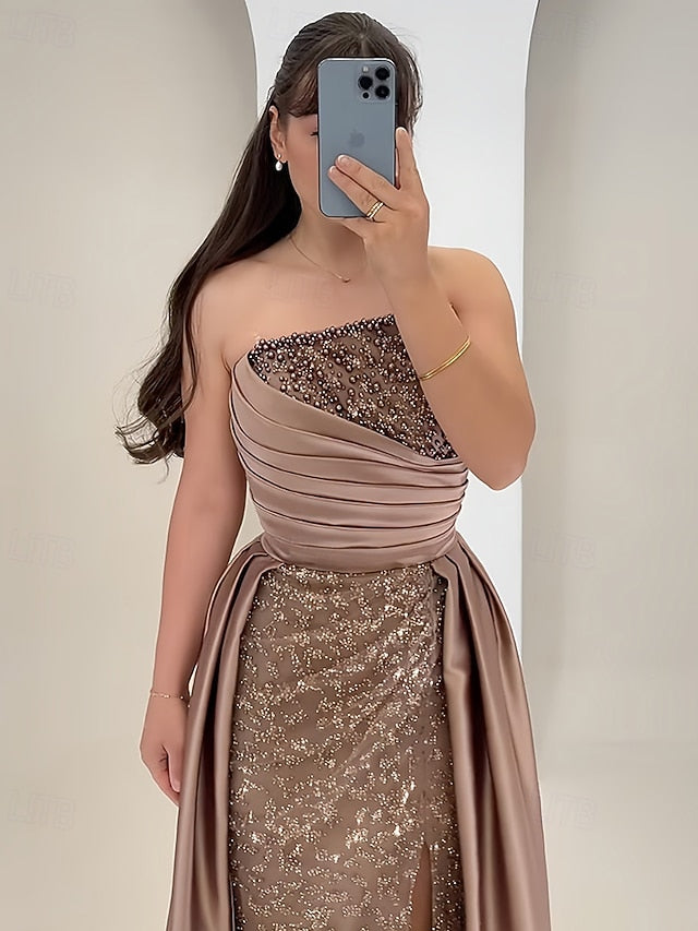 Occasion: Graduation, Wedding, Formal, Style: Silky, Elegant, Silhouette: Mermaid / Trumpet, A-Line, Hemline / Train: Floor Length, Neckline: Strapless, Fabric: Satin, Closure: Zipper UP, Sleeve Length: Sleeveless, Embellishment: Glitter, Ruched, Rhinestone, Built-In Bra: No, Boning: Yes, Tips: Professional dry cleaner only, Colors may vary slightly due to different monitor settings, Features: Champagne Mother Of the Bride Dress,
