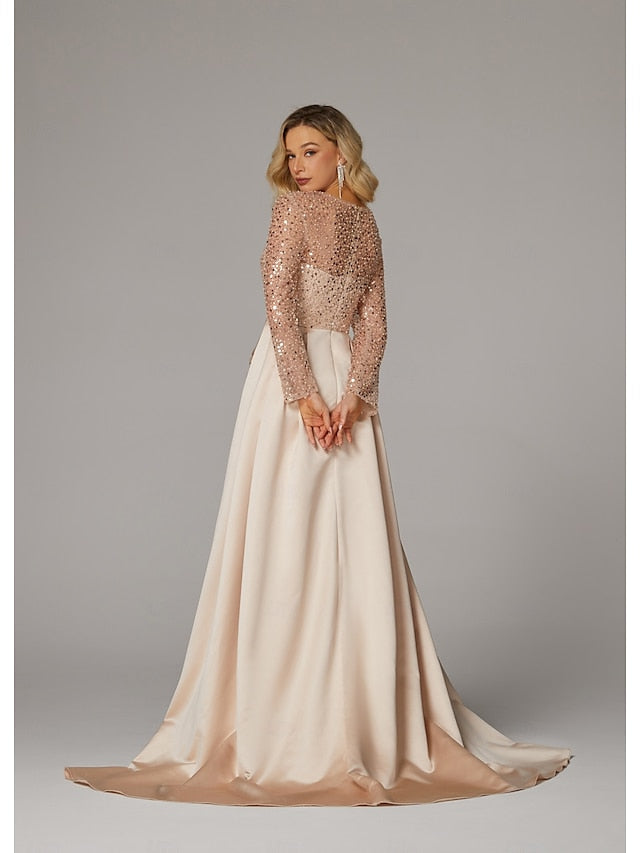 Occasion: Masquerade, Carnival, Style: Elegant, Sparkle & Shine, Silhouette: Mermaid / Trumpet, Hemline / Train: Floor Length, Neckline: Illusion Neck, Fabric: Sequined, Satin, Closure: Zipper UP, Sleeve Length: Long Sleeve, Embellishment: Overskirt, Pearls, Built-In Bra: Yes, Boning: No, Tips: Professional dry cleaner only, Colors may vary slightly due to different monitor settings, Features: Champagne Mother Of the Bride Dress,