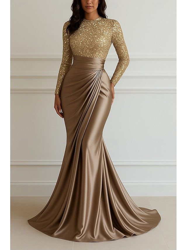 Occasion: Wedding Guest, Formal, Wedding, Style: Elegant, Silky, Silhouette: Mermaid / Trumpet, Hemline / Train: Floor Length, Neckline: Crew Neck, Fabric: Stretch Satin, Closure: Zipper UP, Sleeve Length: Long Sleeve, Embellishment: Pleats, Glitter, Built-In Bra: Yes, Boning: Yes, Tips: Professional dry cleaner only, Colors may vary slightly due to different monitor settings, Features: Champagne Mother Of the Bride Dress,