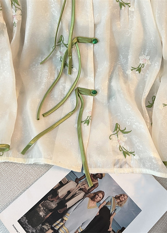 French White Chinese Button Embroidered Chiffon Shirt Long Sleeve JH064