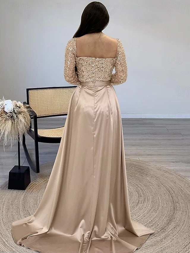 Occasion: Wedding Guest, Formal, Style: Silky, High Split, Elegant, Silhouette: A-Line, Hemline / Train: Floor Length, Neckline: Square Neck, Fabric: Satin, Closure: Zipper UP, Sleeve Length: Long Sleeve, Embellishment: Slit, Glitter, Built-In Bra: No, Boning: No, Tips: Colors may vary slightly due to different monitor settings, Professional dry cleaner only, Features: Detachable, Convertible, Champagne Mother Of the Bride Dress,