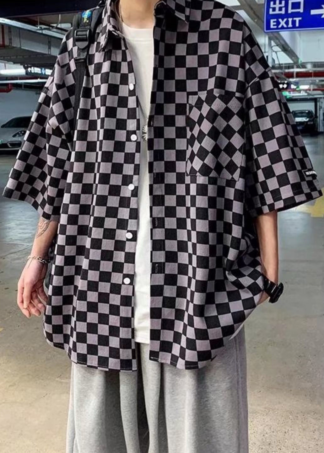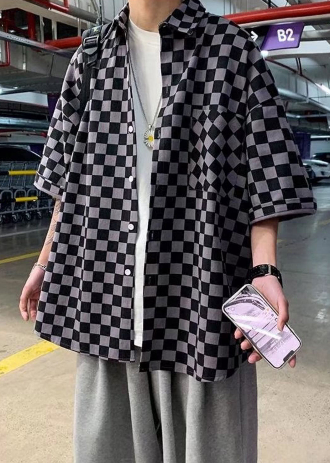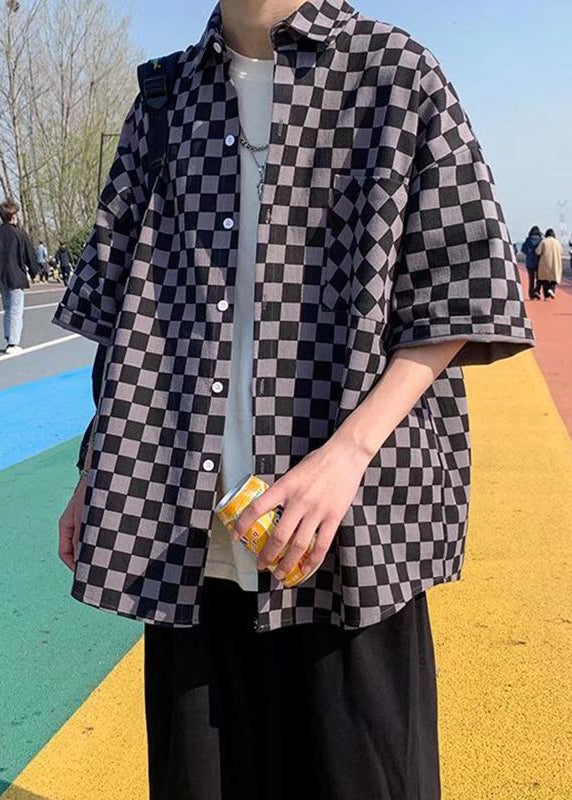 Black Plaid Button Cotton Men Shirts Peter Pan Collar Half Sleeve