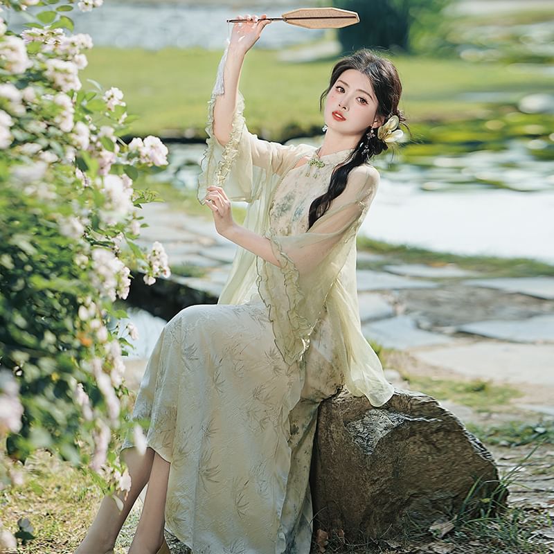 | Color: | Set of 2 - Jacket & Qipao - Floral - Green & Beige |