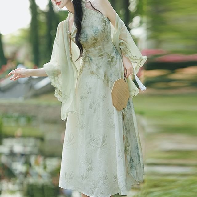 Halter Print Ruffle Trim Midi A-Line Qipao / Ruffle Trim Open Front Light Jacket / Set