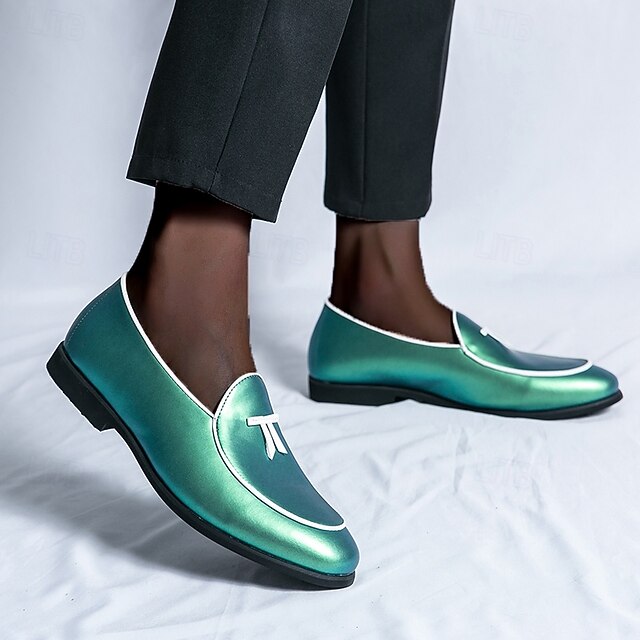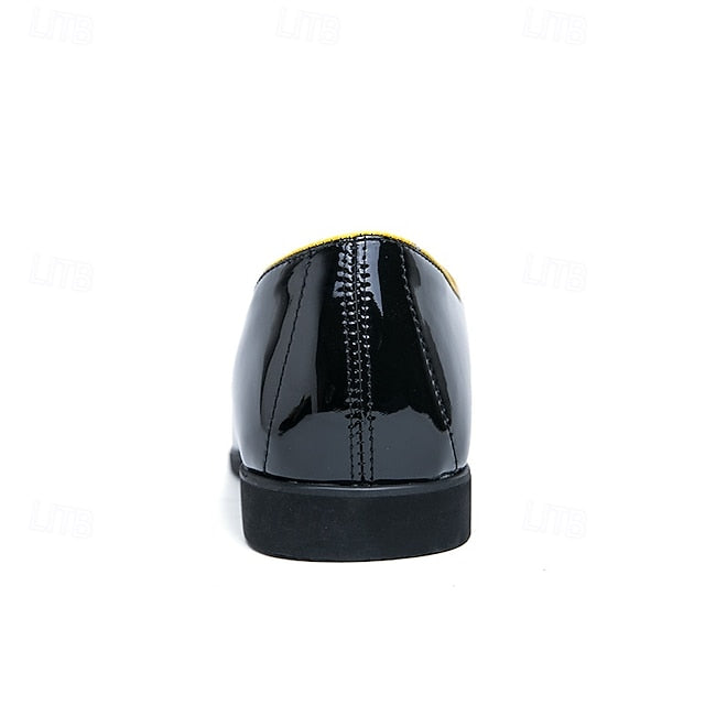 Men's Black Patent Faux Leather Loafers with Yellow Trim