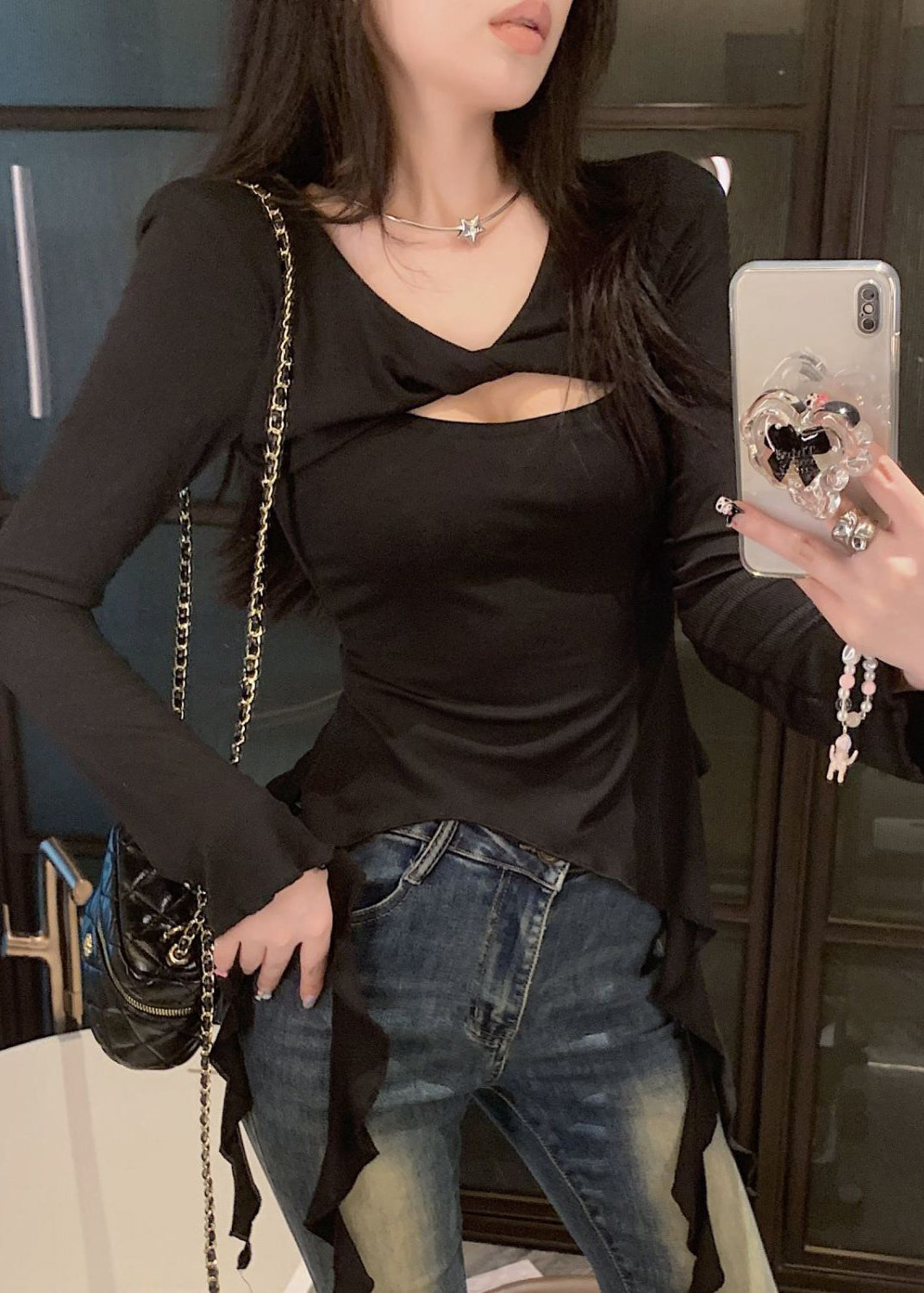 lim Fit Red Asymmetrical Hollow Out Cotton T Shirt Spring