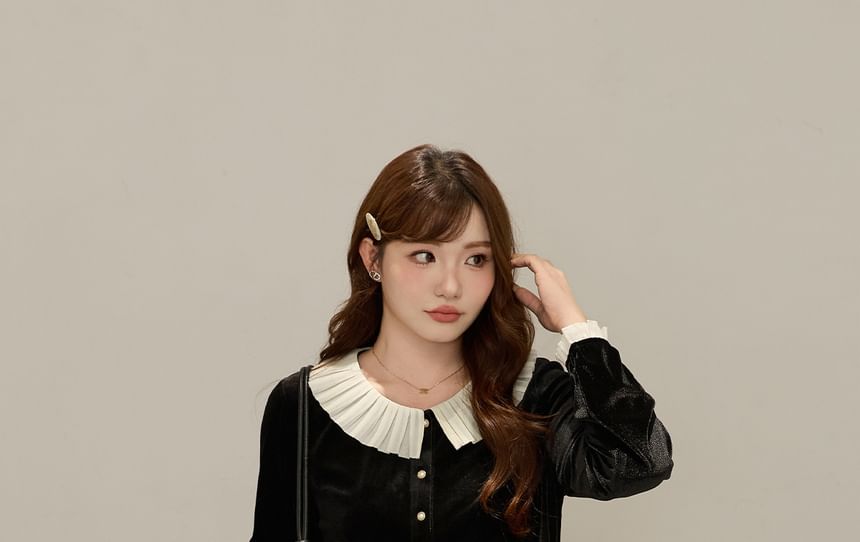 Long Sleeve Collared Two Tone Pleated Panel Velvet Blouse