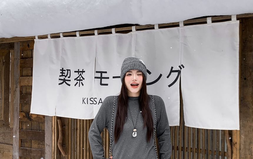 Long-Sleeve Mock Neck Glitter Ruched Tee