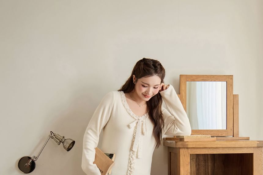 Long-Sleeve V-Neck Dotted Bow Accent Frill Trim Slim Fit T-Shirt