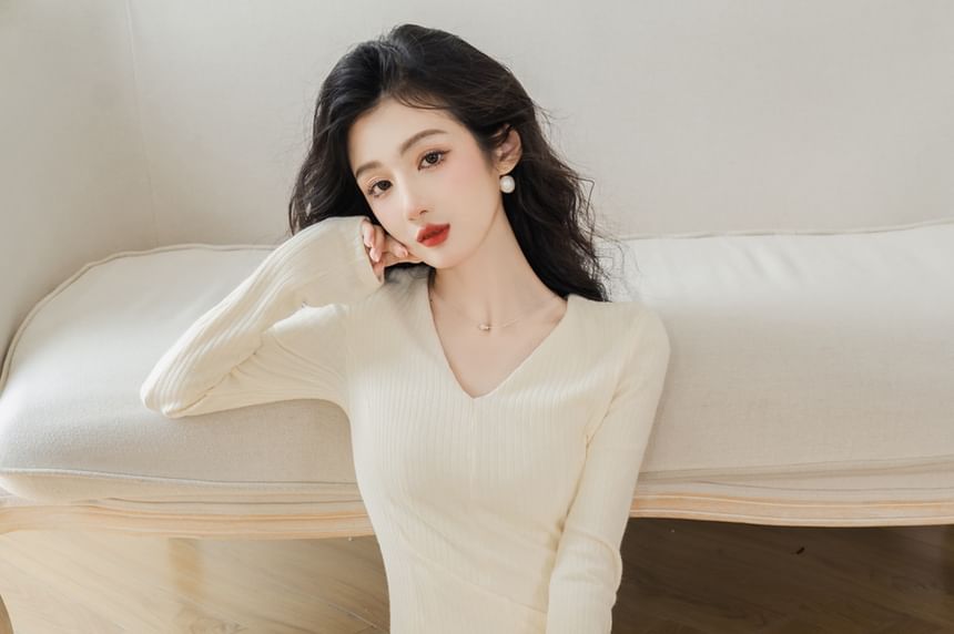 Long-Sleeve V-Neck Plain Midi A-Line Dress
