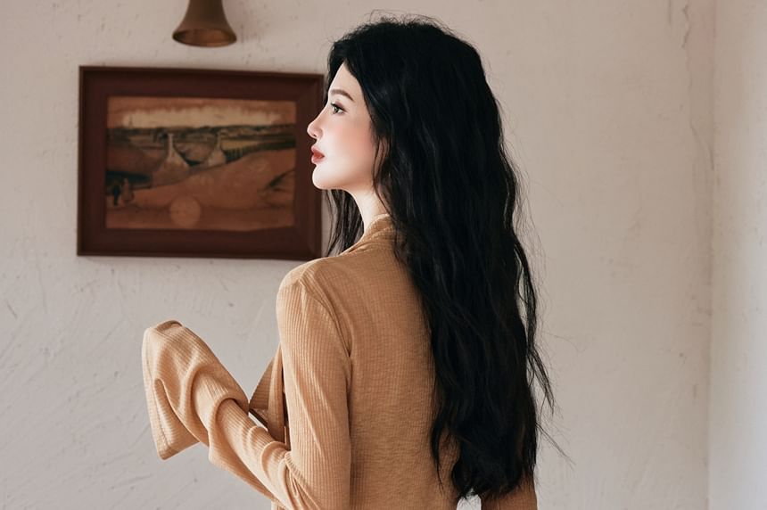 Long-Sleeve V-Neck Ruffle Plain Top / High Waist Plaid Maxi A-Line Skirt / Set