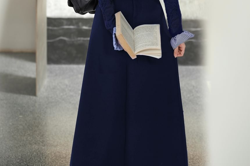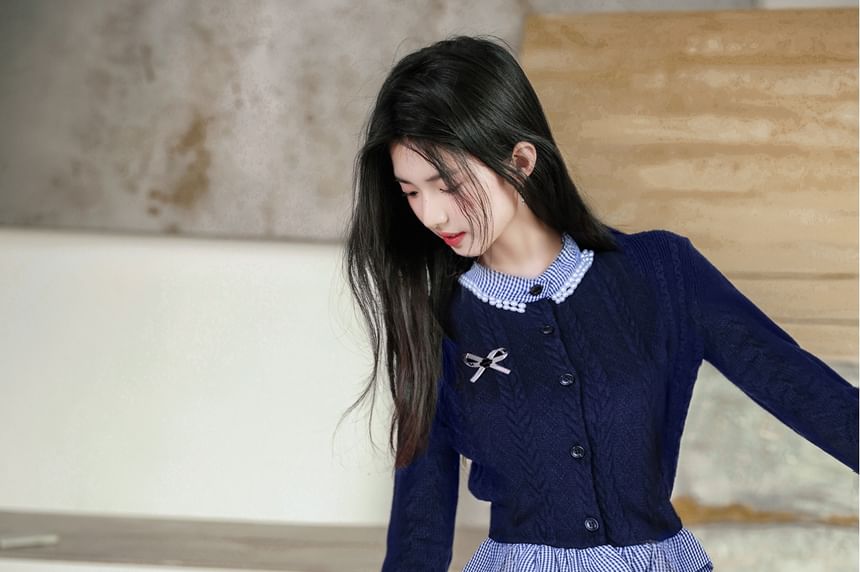 Mock Neck Plaid Ruffle Trim Beaded Cardigan / Brooch / High Waist Plain Maxi A-Line Skirt / Set