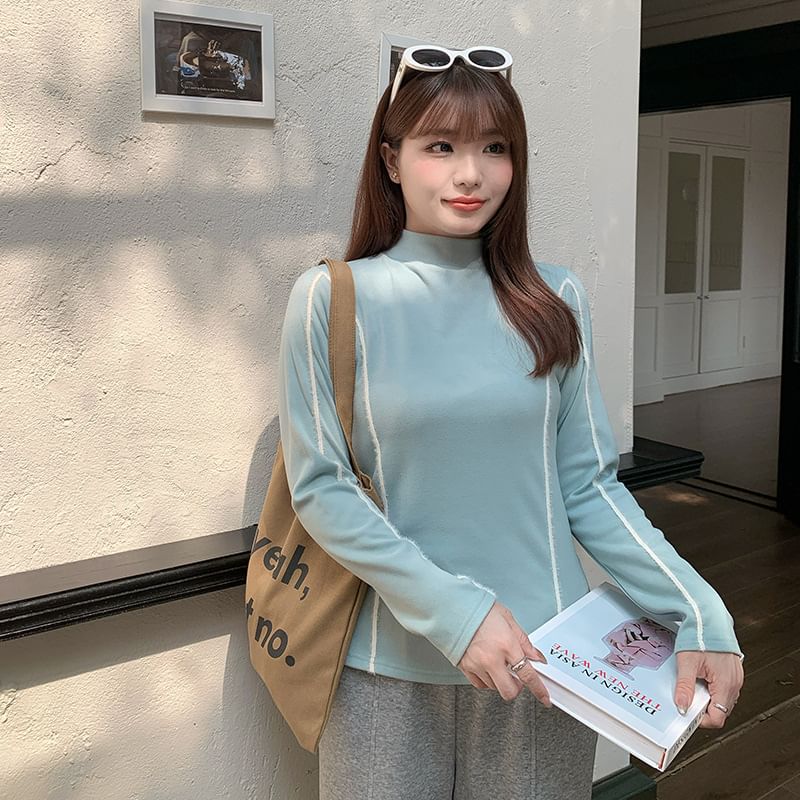 Long-Sleeve High Neck Contrast Trim Knit Top