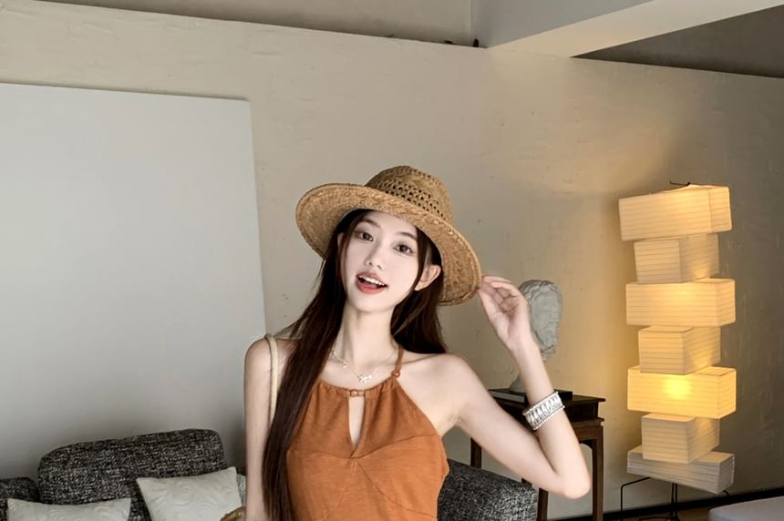 Plain Cutout Asymmetrical Cami Top / High Waist Plaid Lace Panel Maxi A-Line Skirt / Beaded Belt / Set
