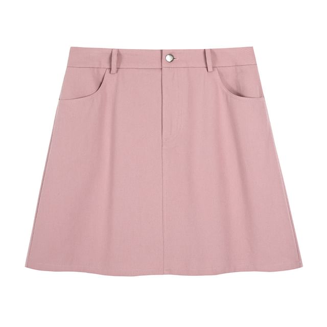Plus Size Long-Sleeve Plaid Shirt / Scoop Neck Plain Tank Top / High Waist Mini A-Line Skirt