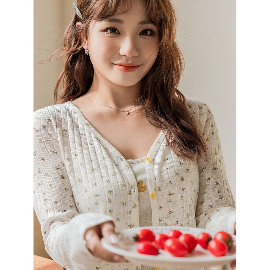 Plus Size V-Neck Floral Ribbed Cardigan