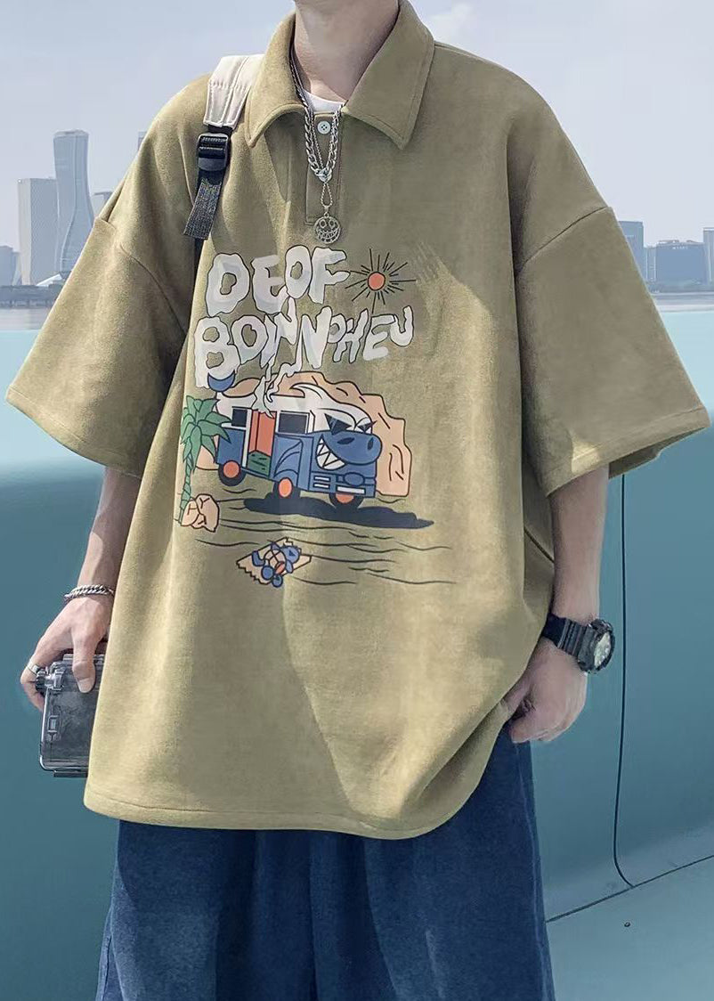 Vintage Green Print Button Cotton Mens Polo Shirts Summer