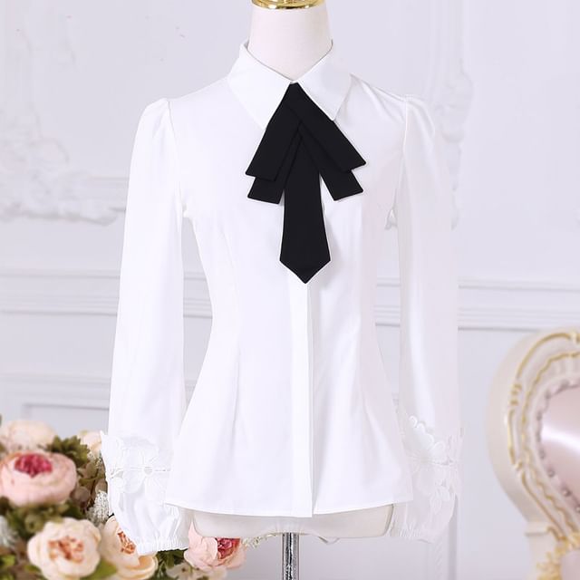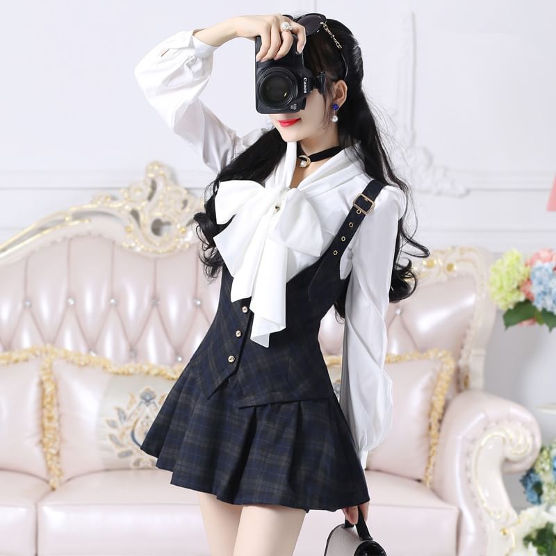 Puff-Sleeve Plain Button-Up Shirt / Plaid Buckled Jumper Shorts / Set