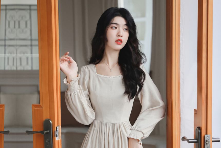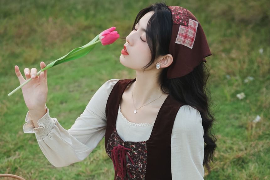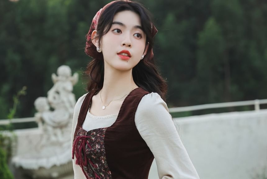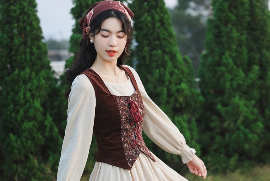 Puff-Sleeve Square Neck Plain Lace Trim Maxi A-Line Dress / Floral Lace-Up Vest / Kerchief / Set