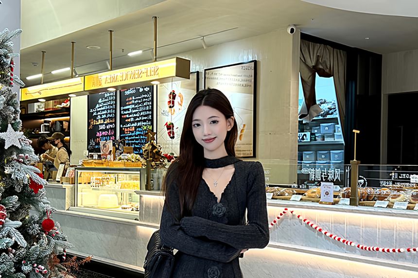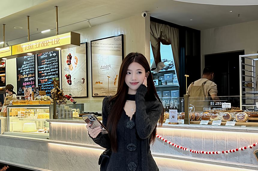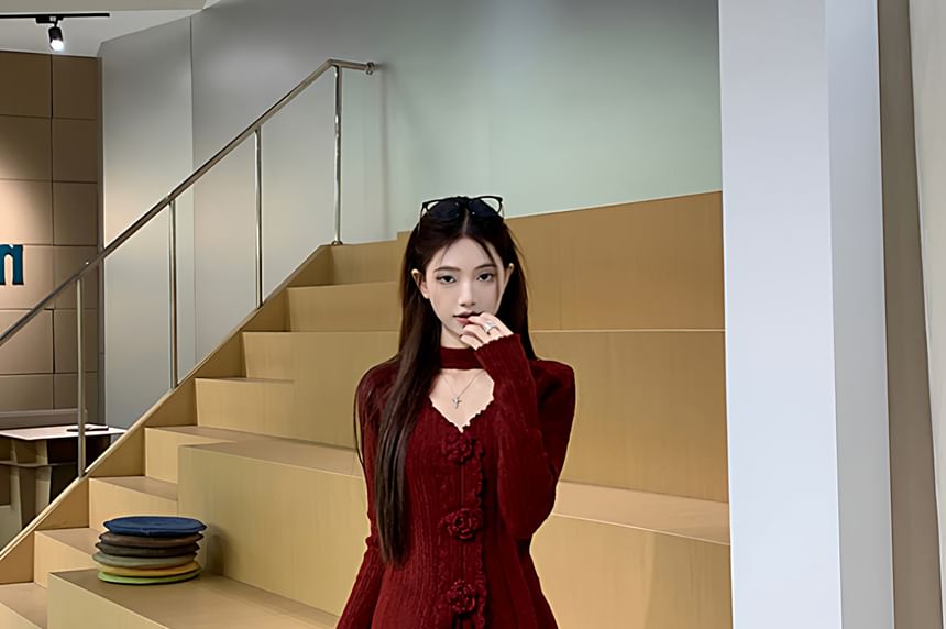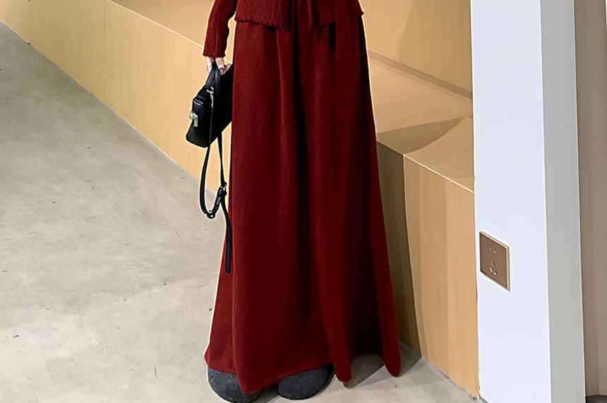 Set: Long Sleeve V-Neck Plain Floral Detail Knit Top + High Waist Maxi A-Line Skirt