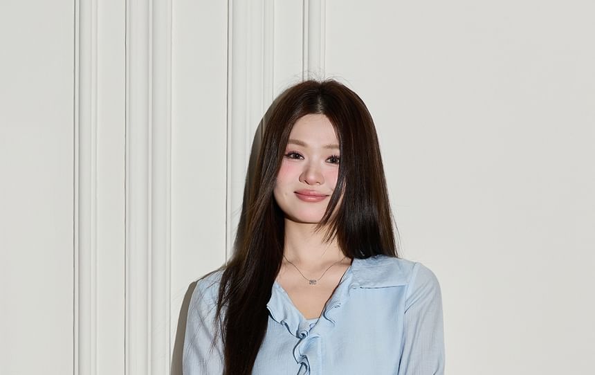 Set: Long Sleeve V-Neck Plain Ruffle Blouse + High Rise Asymmetrical Midi A-Line Skirt