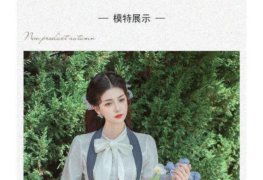 Set: Long-Sleeve Bow-Neck Blouse + Halter Striped Midi A-Line Skirt