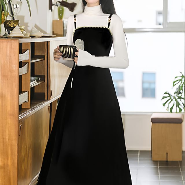 Set: Long-Sleeve Mock Neck Top + Spaghetti Strap Maxi A-Line Dress