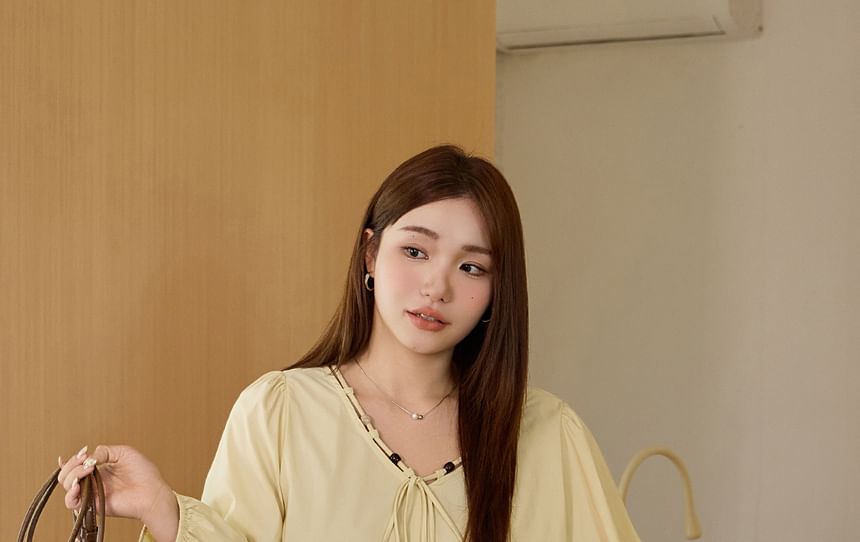 Set: Long-Sleeve V-Neck Plain Beaded Tie Front Blouse + High Waist Midi A-Line Skirt