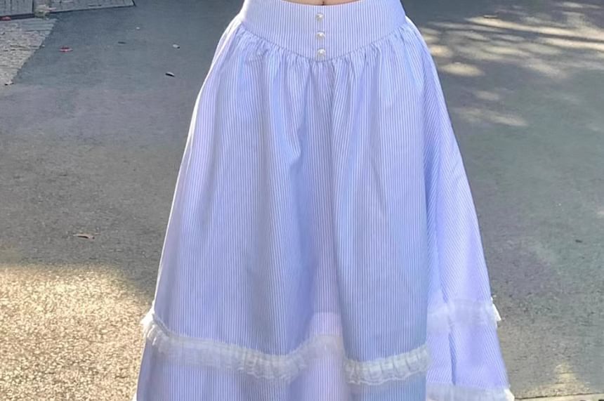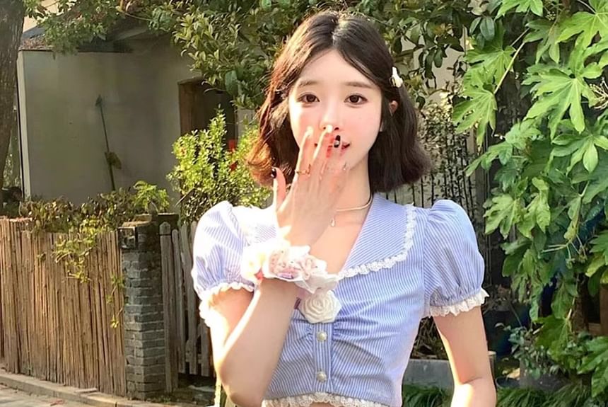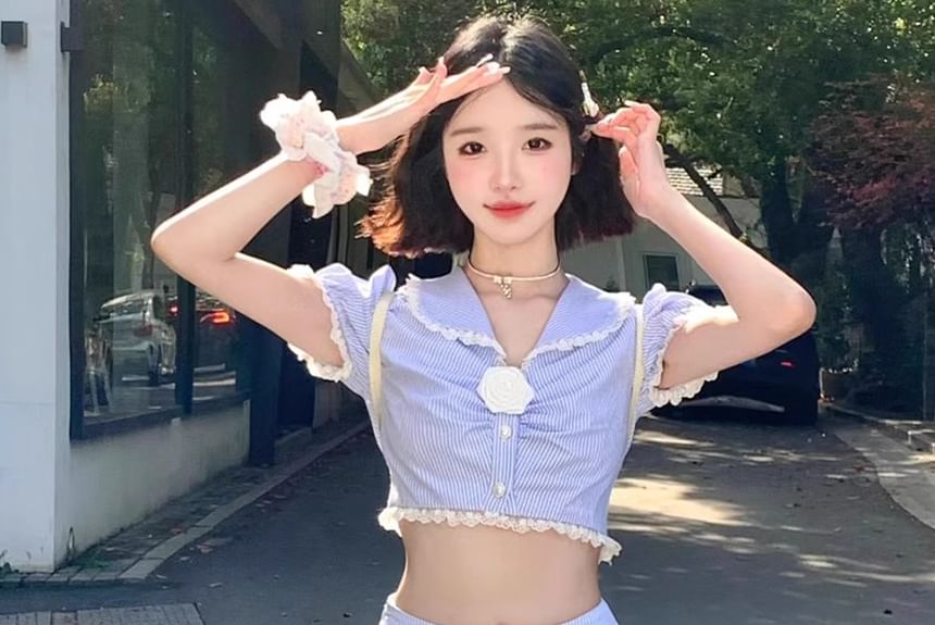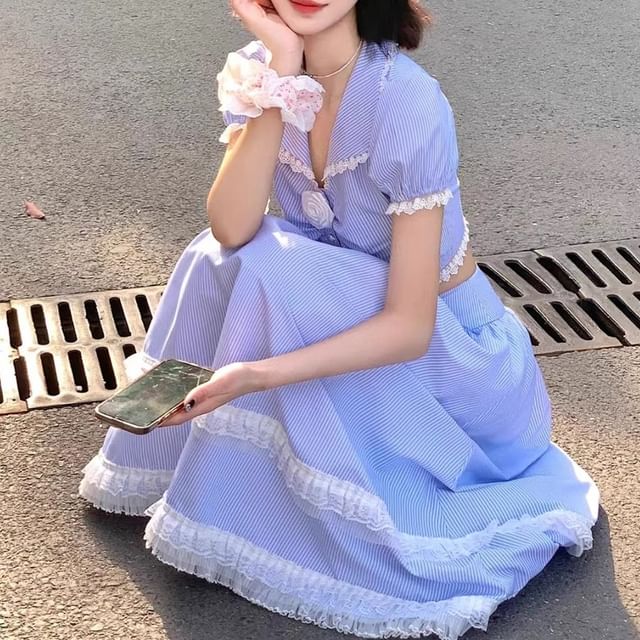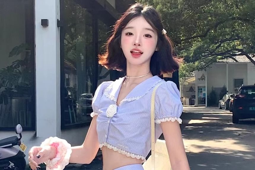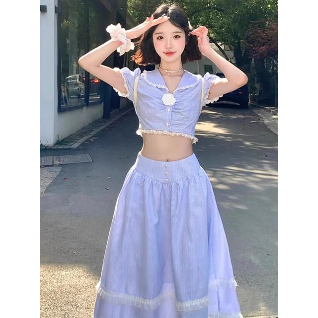 Set: Short-Sleeve Collared Flower Detail Ruched Crop Blouse + High Rise Ruffle Midi A-Line Skirt