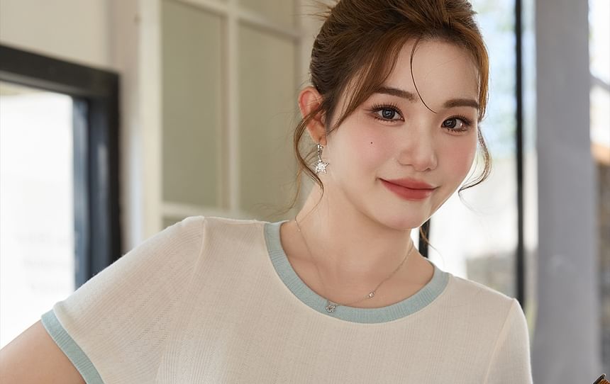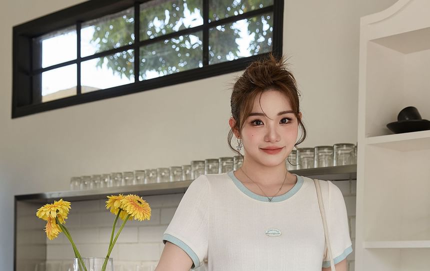 Short-Sleeve Crew Neck Lettering Embroidered Contrast Trim Tee