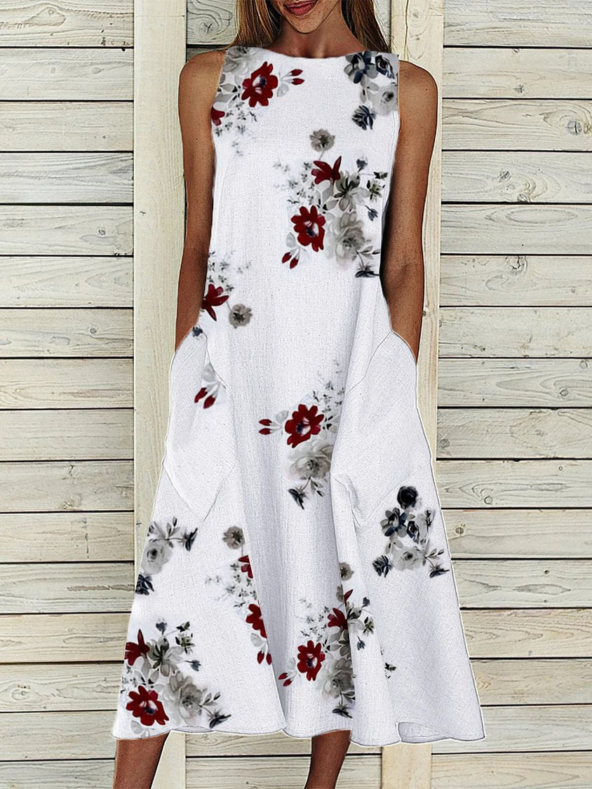 Floral Printed Sleeveless Cotton Blend Shift White Casual Dress NNq8