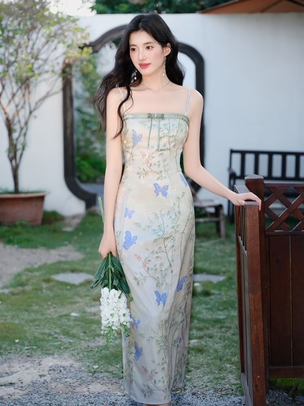 Spaghetti Strap Butterfly Print Midi A-Line Dress / Cardigan / Set