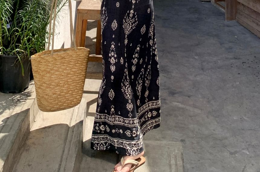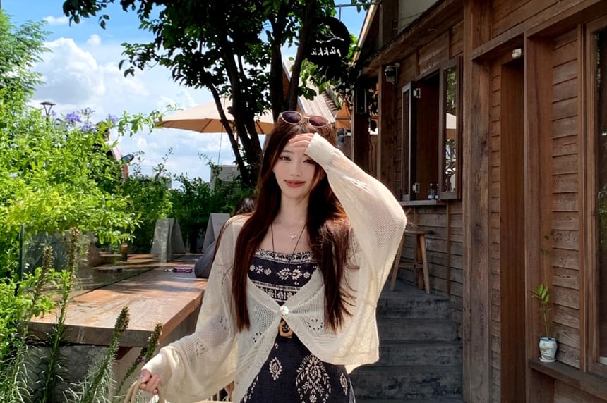 Spaghetti Strap Floral Print Maxi A-Line Dress / Plain Perforated One-Buttoned Cardigan / Set