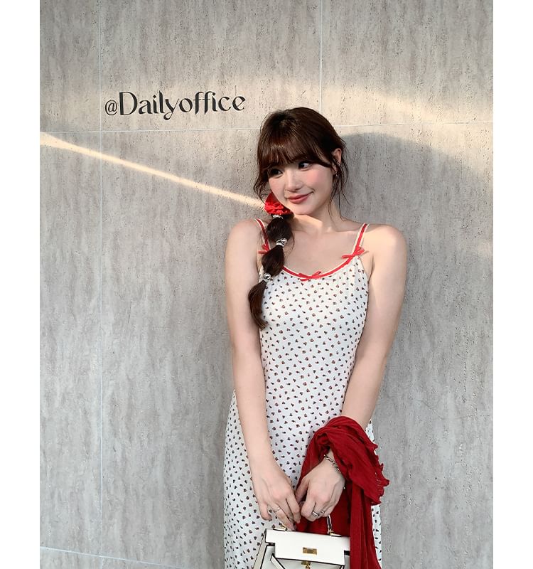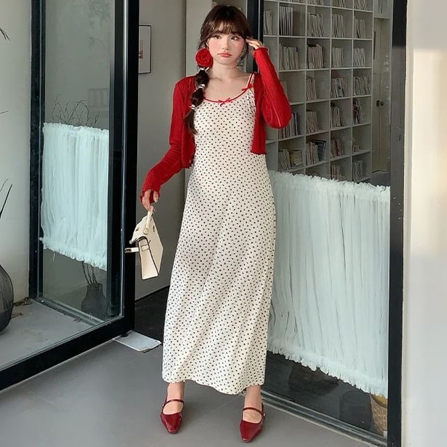 Spaghetti Strap Floral Print Maxi Dress / Plain Crop Cardigan