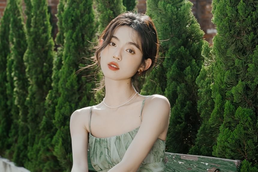 Spaghetti Strap Print Midi A-Line Sundress / Plain Ruffle Trim Crop Cardigan / Set
