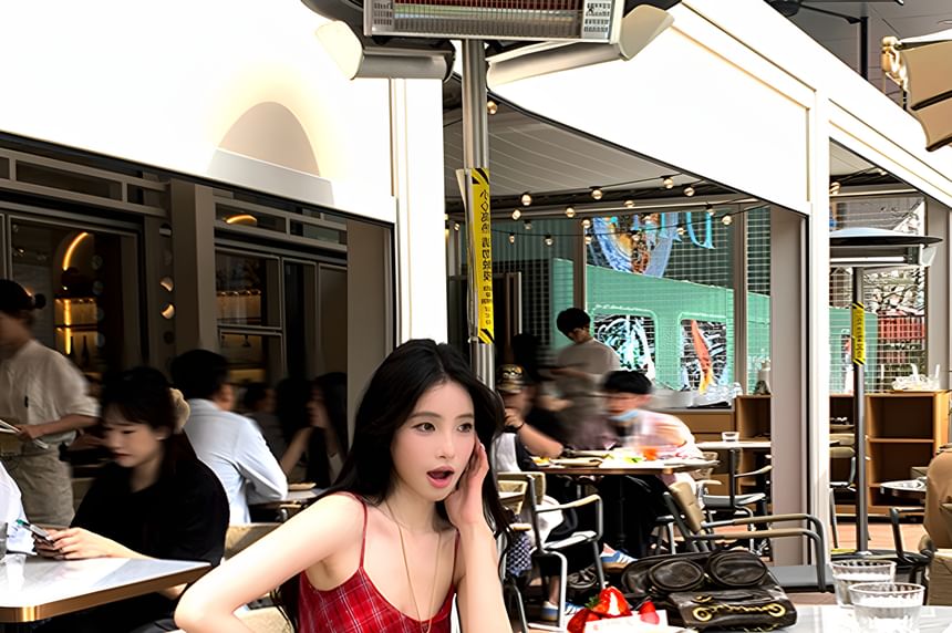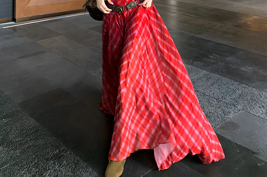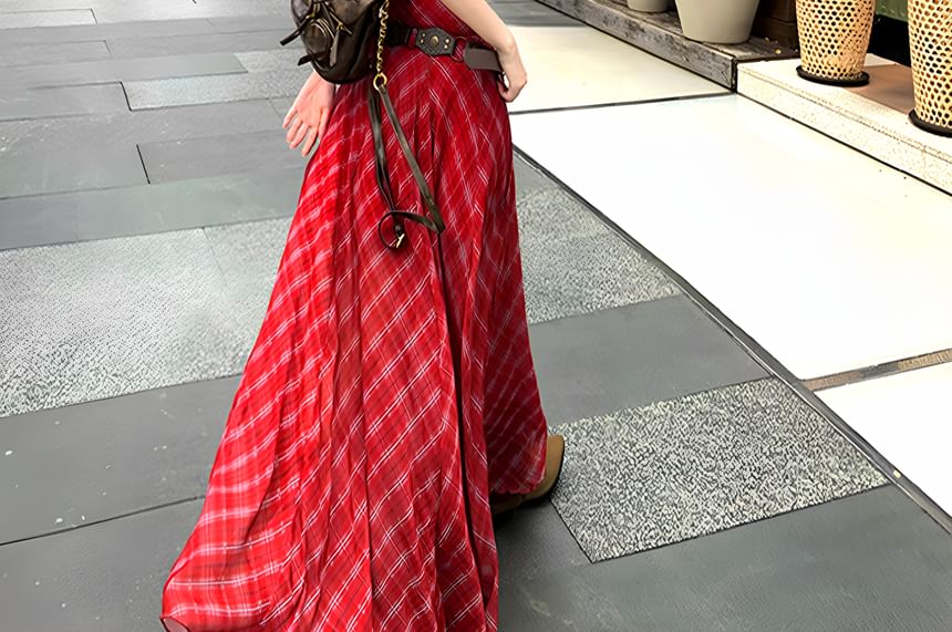 Spaghetti Strap Scoop Neck Plaid Maxi Sundress / Belt / Set