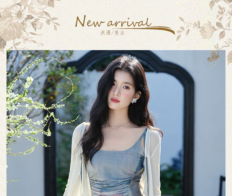Spaghetti Strap Scoop Neck Tie Dye Ruched Mesh Maxi A-Line Dress / Plain Tie Front Crop Cardigan / Set