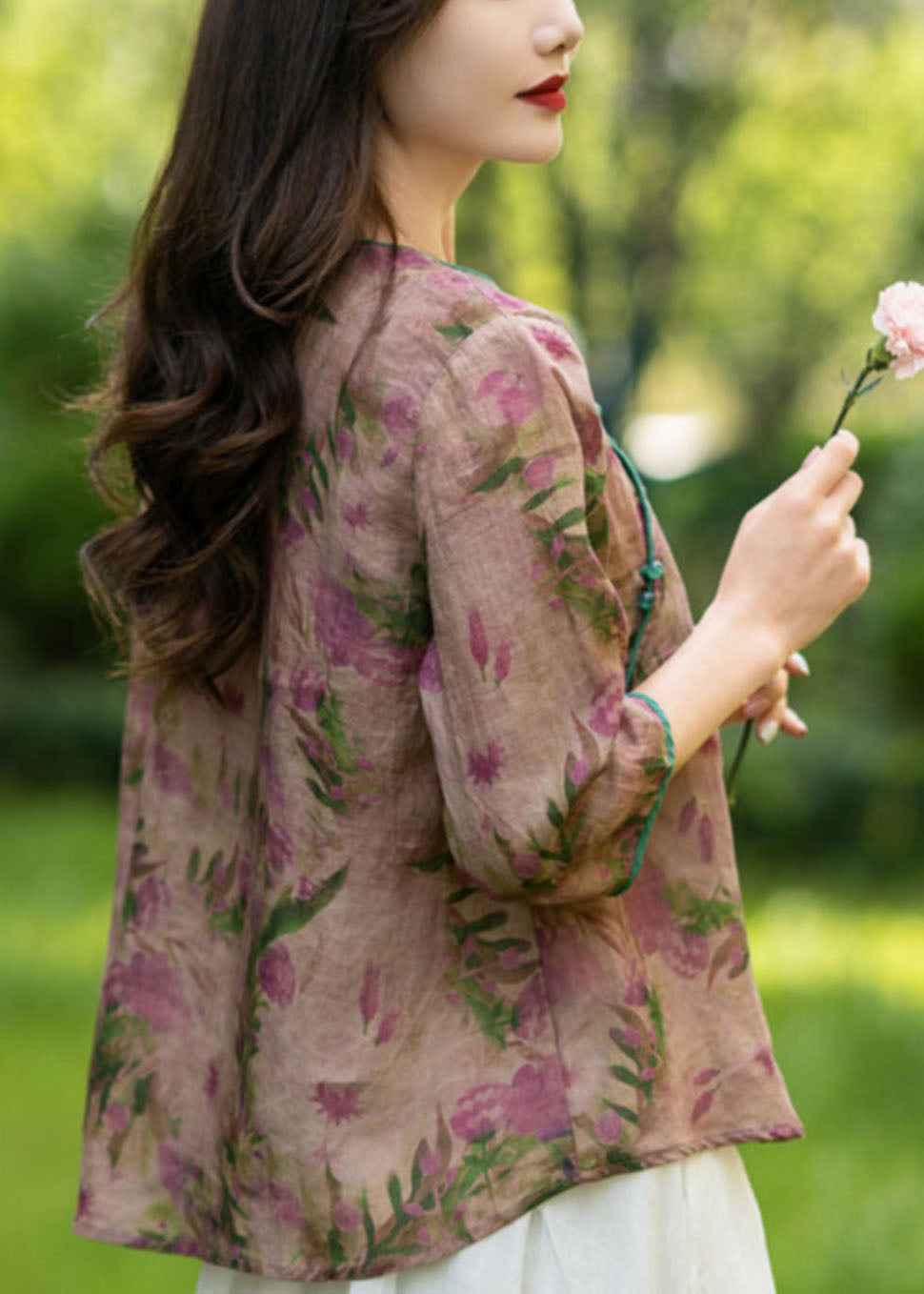 Elevate your wardrobe with our Vintage Pink Floral Linen Shirts featuring delicate bracelet sleeves. Perfect for a touch of sophistication and elegance.