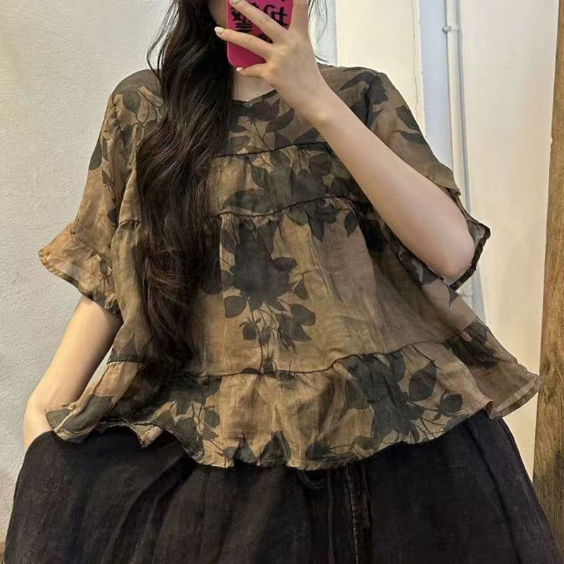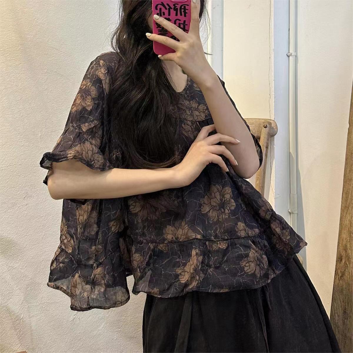 Vintage Navy Blue Print Patchwork Linen Top Summer VB1063