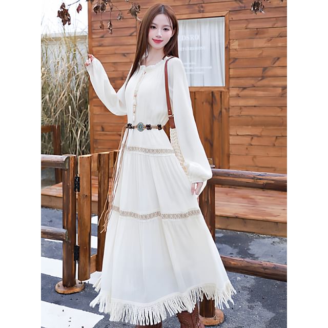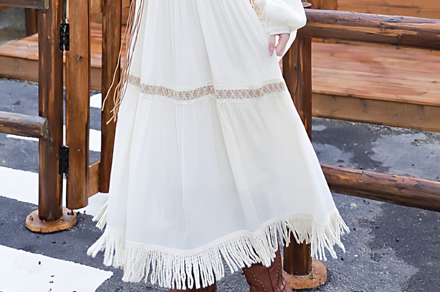 V-Neck Embroidered Tassel Tie Front Vest / Long-Sleeve Fringed Tiered Midi A-Line Dress / String Belt / Set