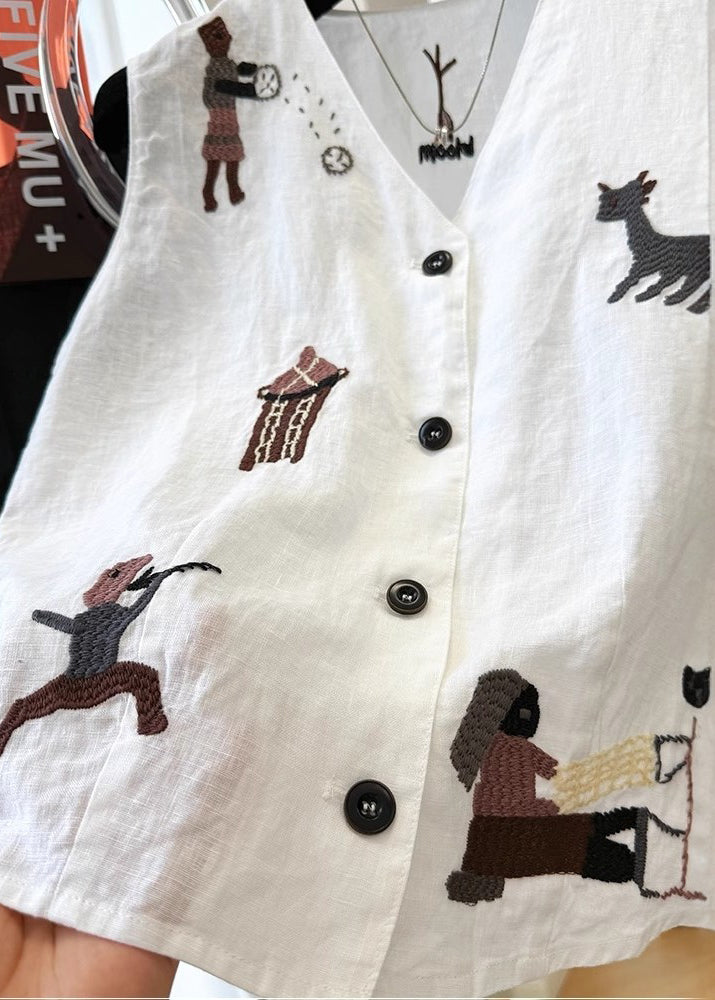 Women White V Neck Embroideried Cotton Vest Sleeveless