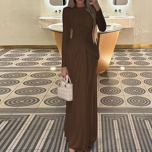 Dresses Type: Prom Dress, Satin Dress, Party Dress, Fabric: Spandex, Polyester, Gender: Women's, Design: Ruched, Occasion: Evening Party, Party, Special Occasion, Style: Modern, Elegant, Fit Type: Regular Fit, Dress Length Type: Long Dress Maxi Dress, Neckline: Crew Neck, Sleeve Length: Long Sleeve, Elasticity: Micro-elastic, Look After Me: Hand wash, Pattern: Plain, Season: Winter, Fall,